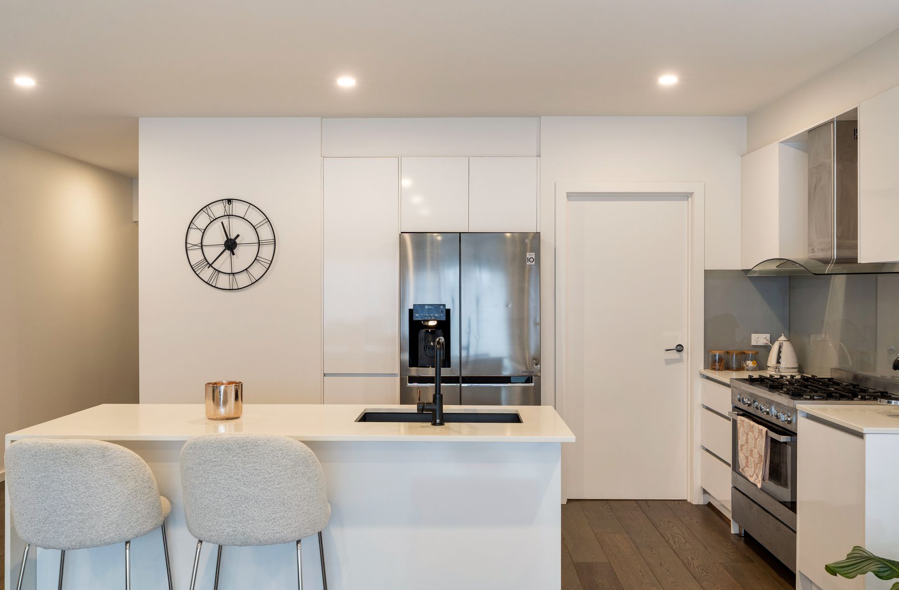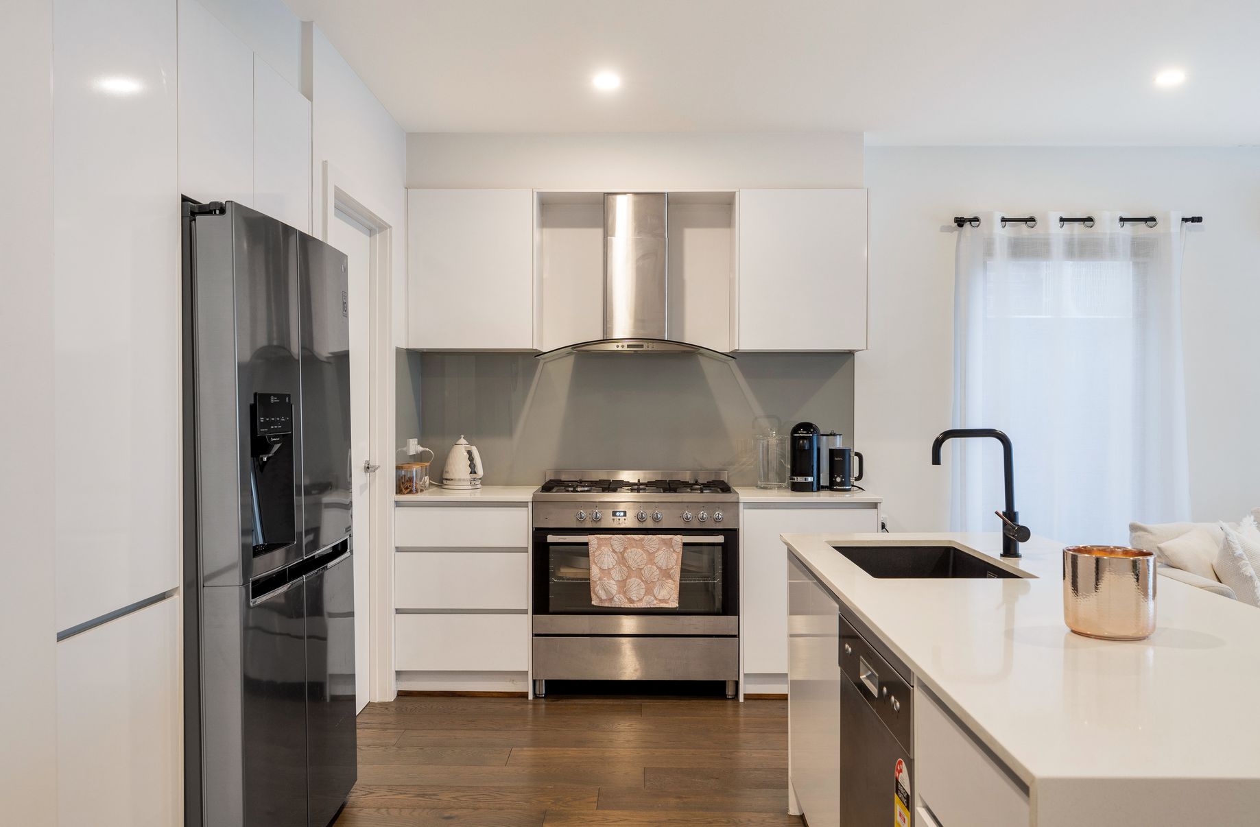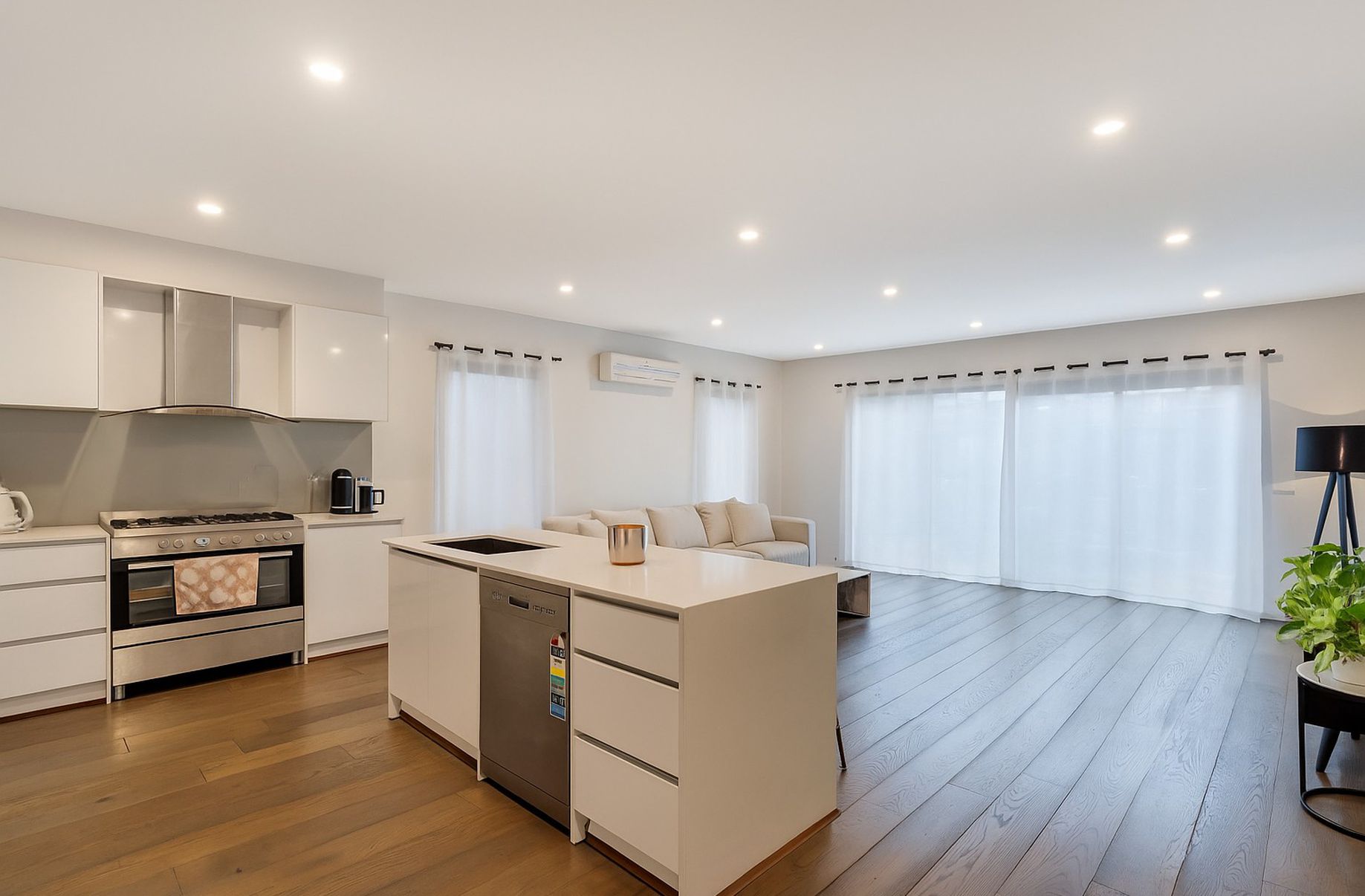 A light-filled open-plan layout that seamlessly connects the living, dining, and kitchen zones to a private, low-maintenance courtyard. The sleek kitchen is a standout feature, boasting stone benchtops with a waterfall island, matte black tapware, gas cooktop, 900mm stainless steel appliances, and generous storage throughout.