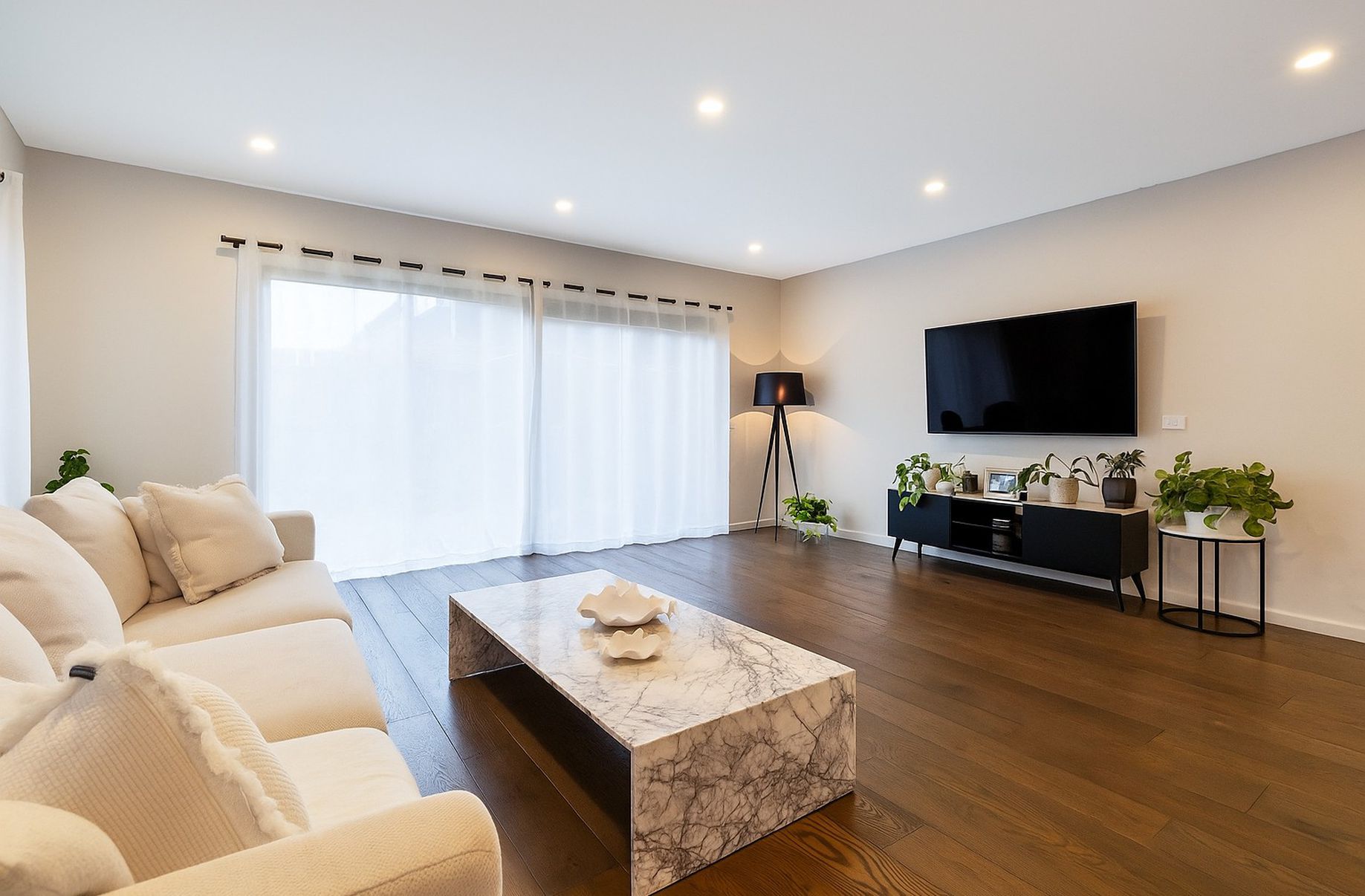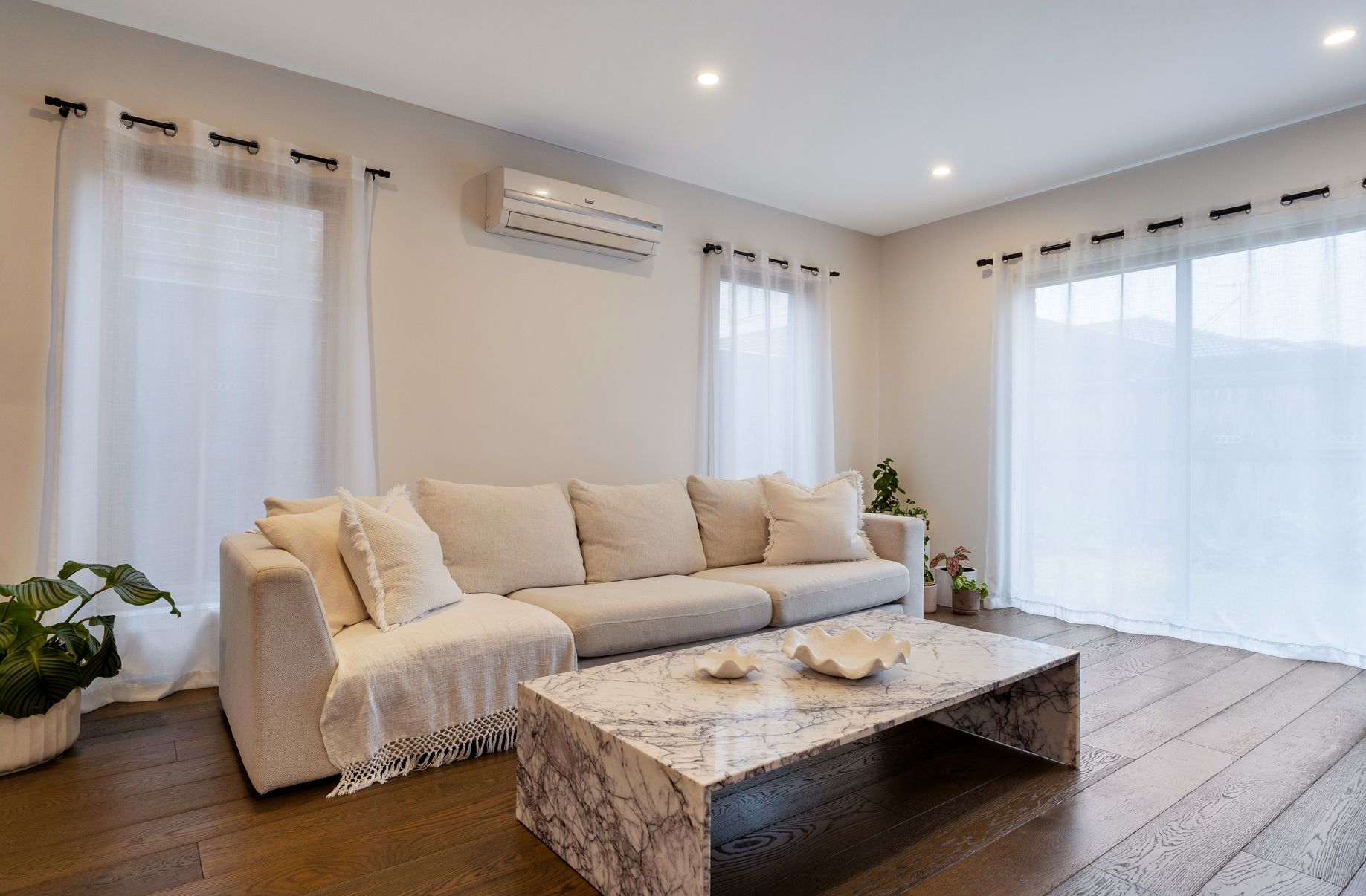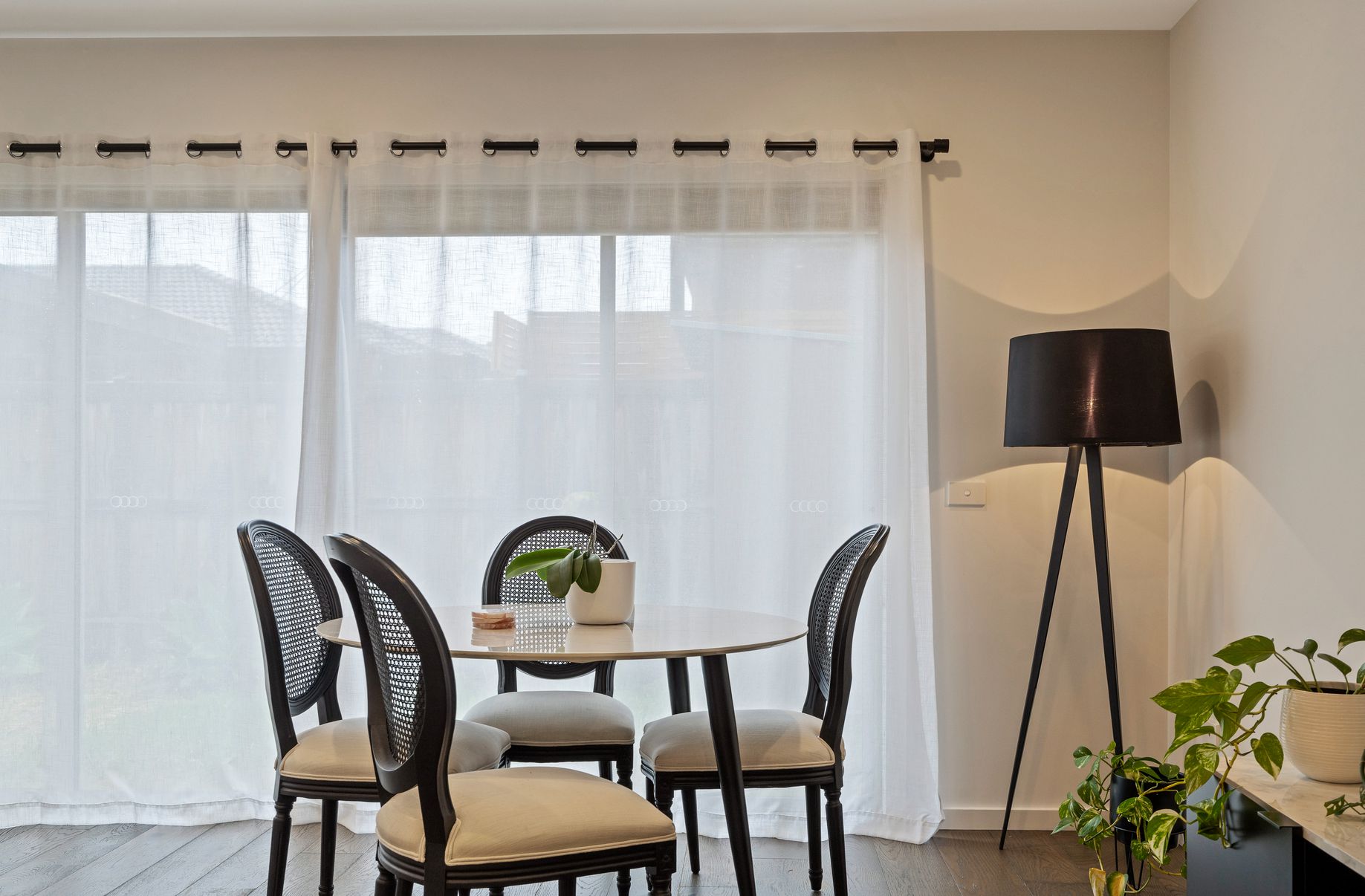 A light-filled open-plan layout that seamlessly connects the living, dining, and kitchen zones to a private, low-maintenance courtyard. The sleek kitchen is a standout feature, boasting stone benchtops with a waterfall island, matte black tapware, gas cooktop, 900mm stainless steel appliances, and generous storage throughout.