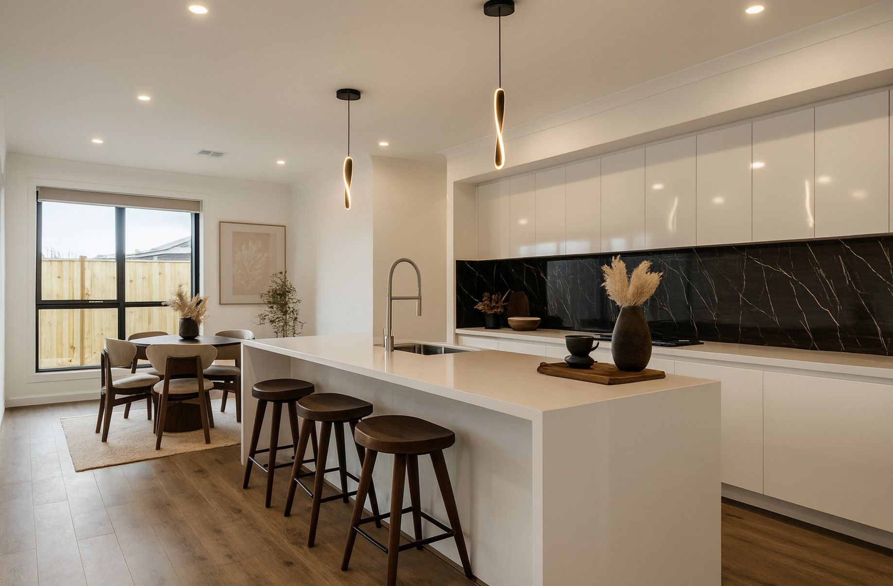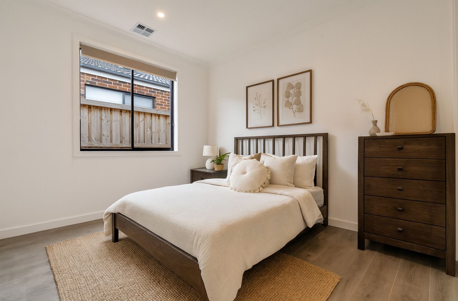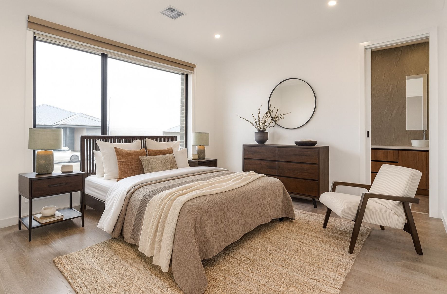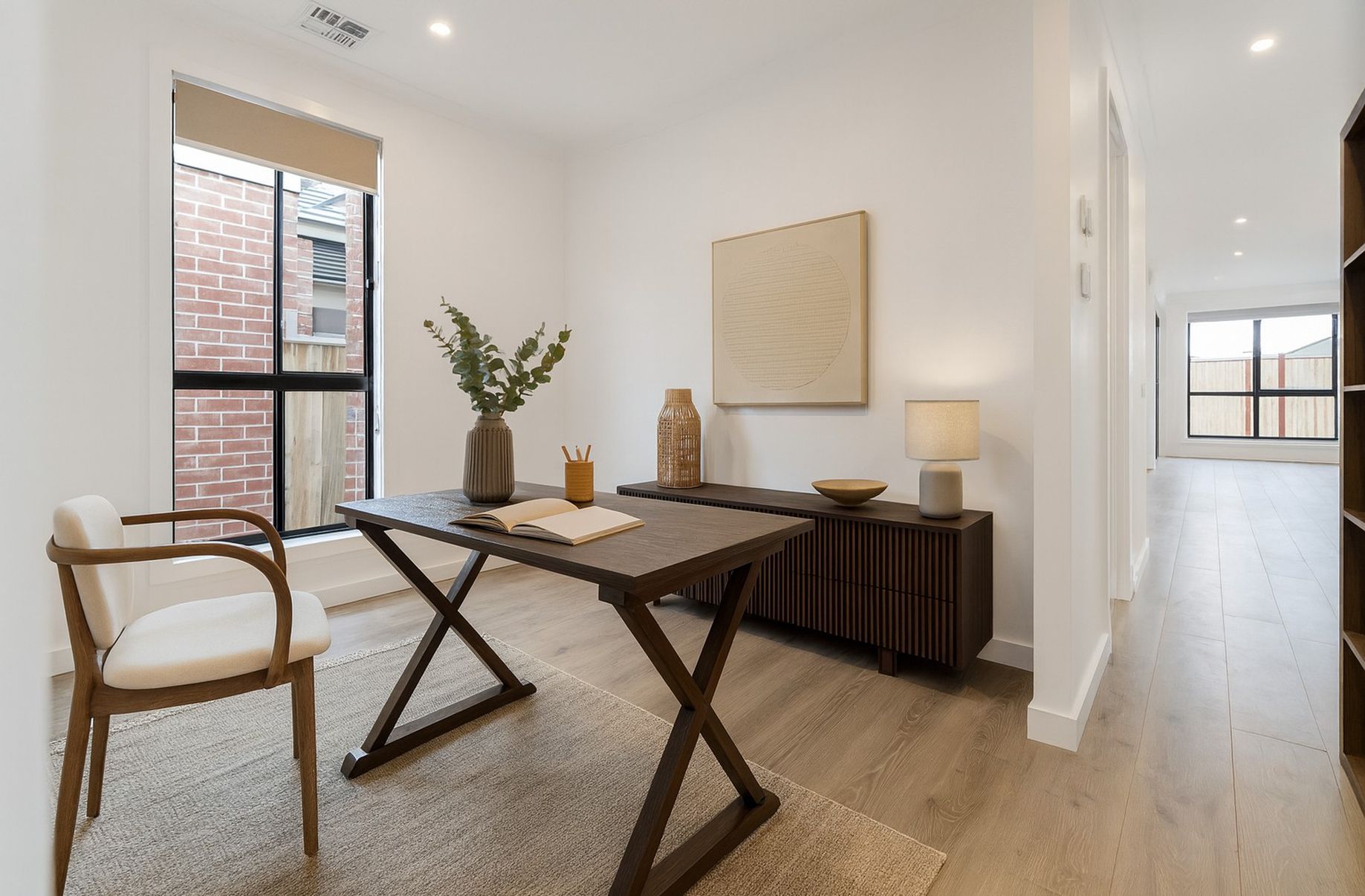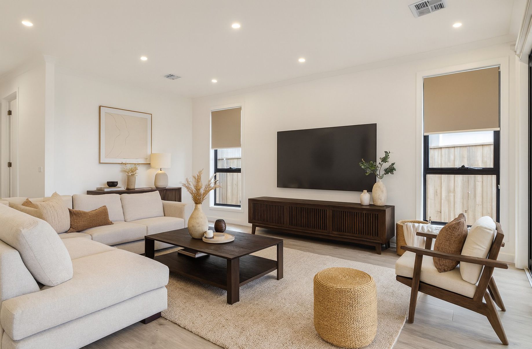 - Downlights, modern blinds and alarm system.