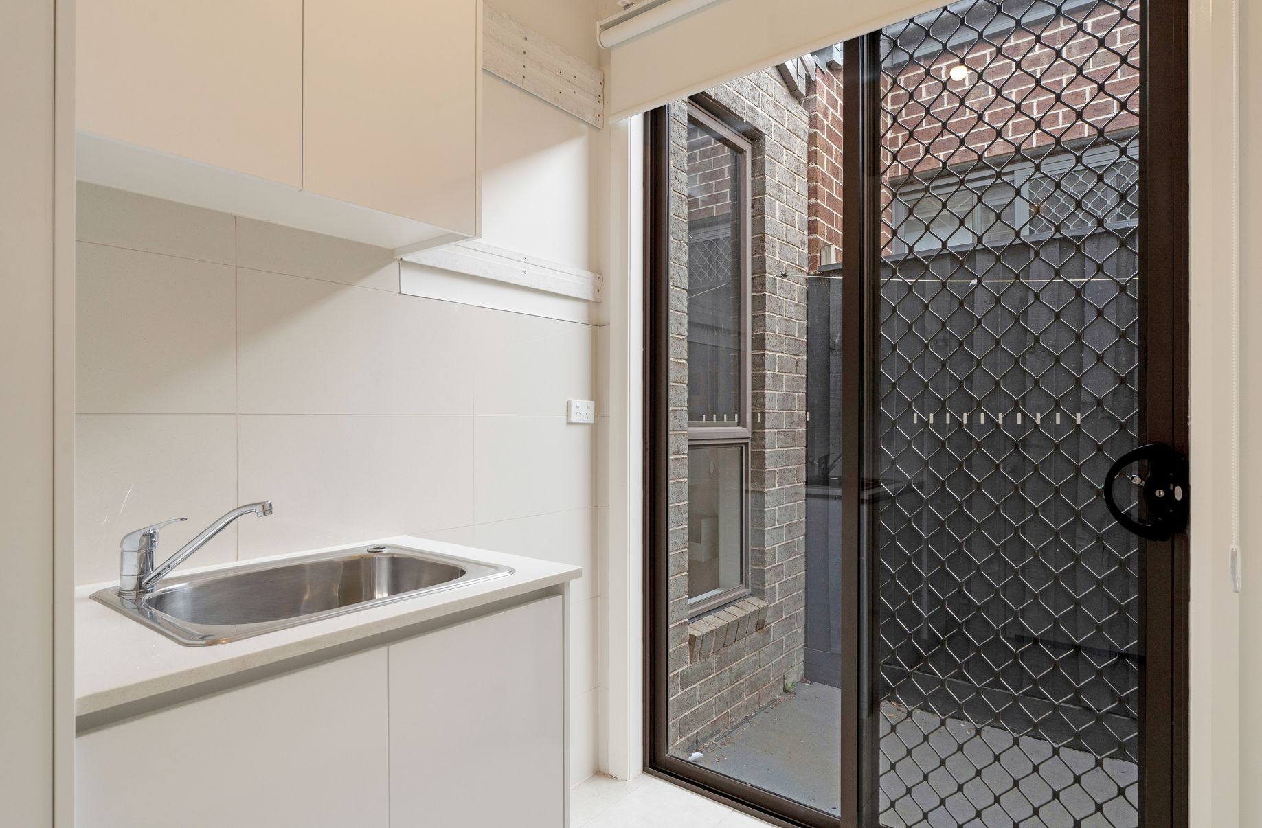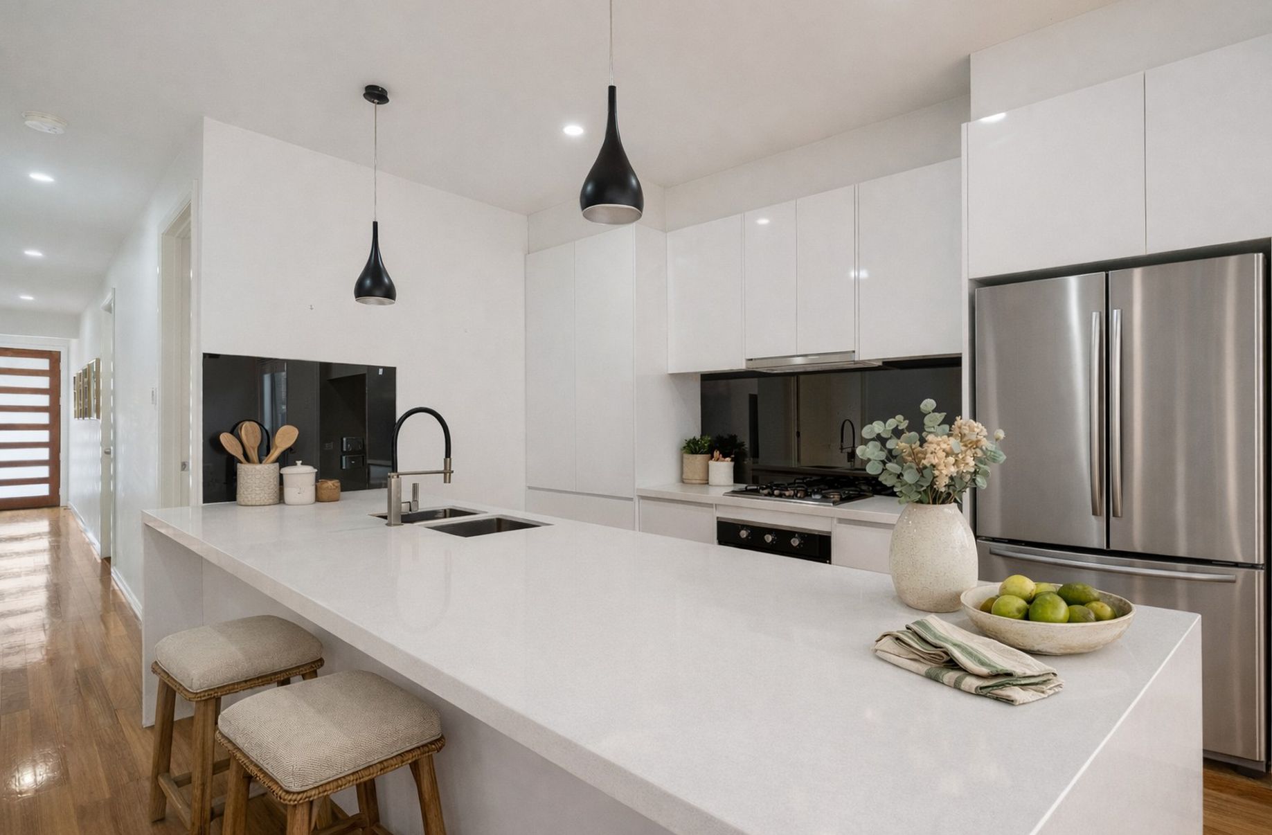At the heart of the home is a stylish kitchen showcasing a stone waterfall benchtop with stain steel appliances and pendent lighting, seamlessly connecting to the open-plan living and meals area. This inviting space flows effortlessly to the alfresco area, making it ideal for entertaining and relaxed family living. The laundry is well appointed with cabinetry and provides convenient access to a private courtyard.