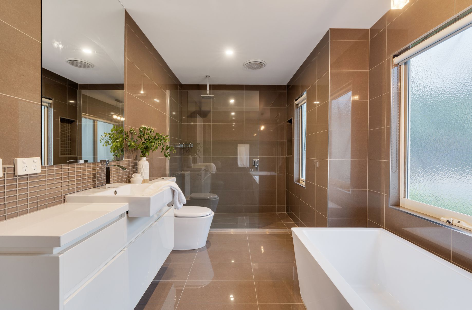 Upstairs, the accommodation is cleverly arranged with generously sized bedrooms featuring built-in robes, pendant lighting and dedicated study nooks, ideal for remote work or growing households. The expansive main suite offers a fully fitted dressing room and a beautifully finished ensuite with rain shower and full-height tiling. A central bathroom showcases a freestanding bath, refined detailing and a distinctive round feature window, while the ground-floor powder room with integrated laundry and full-height tiling adds further practicality.