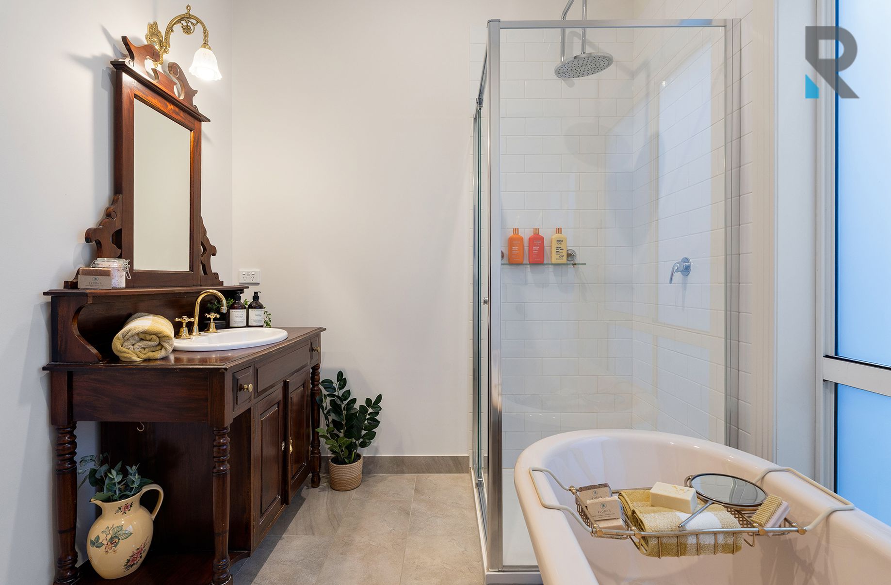 At the heart of the home, the showstopper kitchen combines charm with functionality to create a welcoming space for everyday living. White cabinetry pairs with timber flooring, while a copper rangehood and freestanding red cooker introduce character and style. A central island with breakfast bar seating provides the perfect space for casual meals and entertaining, complemented by stone benchtops and a gooseneck tap. Pendant lighting enhances the atmosphere, while the window splashback fills the kitchen with natural light and a pleasant outlook. Complete with a walk-in pantry, wine storage, and connection to the dining area, the kitchen overlooks the open-plan meals and family space, forming the home’s central living hub.
