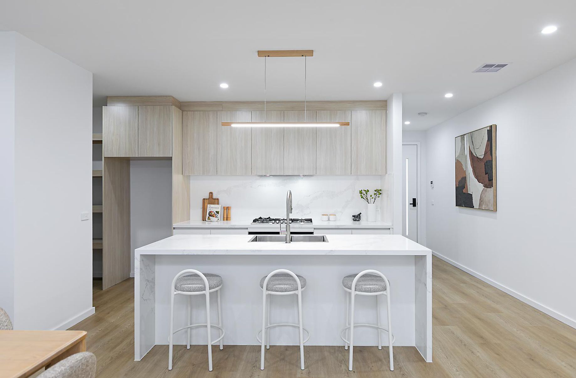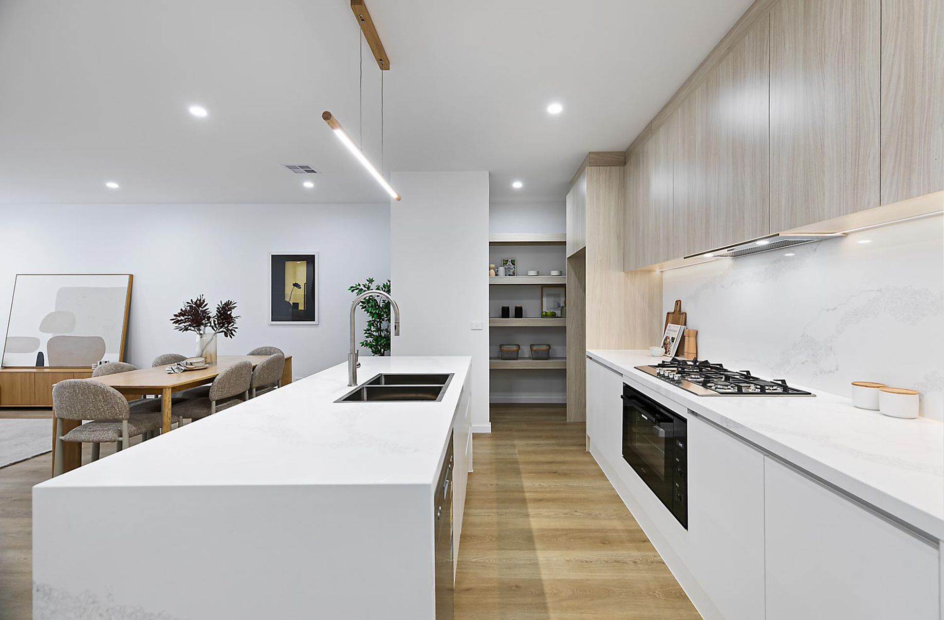 At the centre of the home is a stunning open plan living, dining and kitchen area designed for both entertaining and everyday practicality. The gourmet kitchen is fitted with stone benchtops, 900mm cooking appliances, a spacious breakfast bench and a well-organised walk-in pantry, making it a functional and stylish hub of the home.